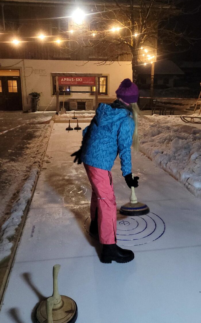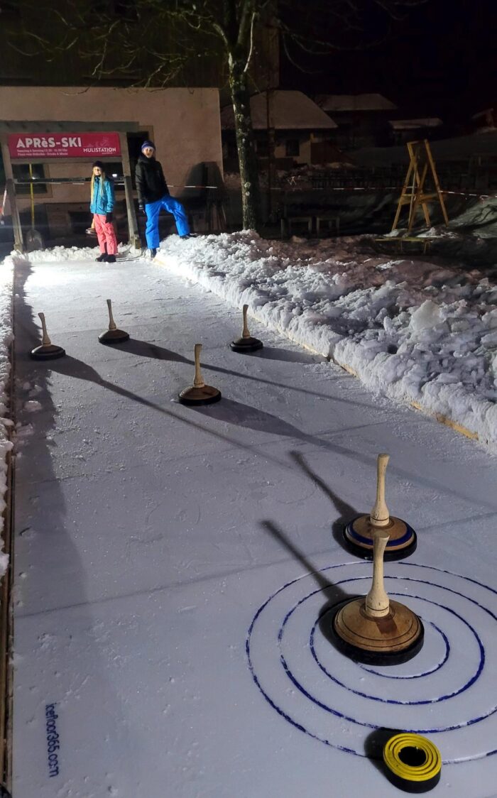 Nur 10 Meter vom Schlepplift entfernt steht das Wirtshaus „Jaegers“, auf dessen Rückseite (zeigt zum Rodelhügel) eine Eisstockbahn untergebracht ist. Diese darf von allen kostenlos genutzt werden, die Tickets für die Rodelbahn kaufen. Für meine Kinder war es tatsächlich der erste Versuch und wir haben uns alle prächtig amüsiert.