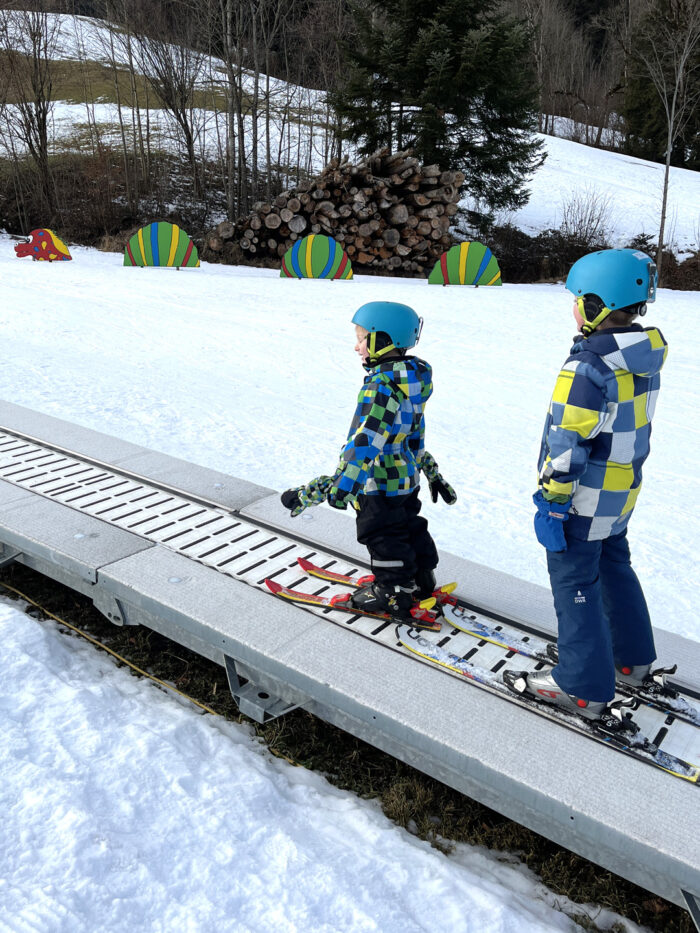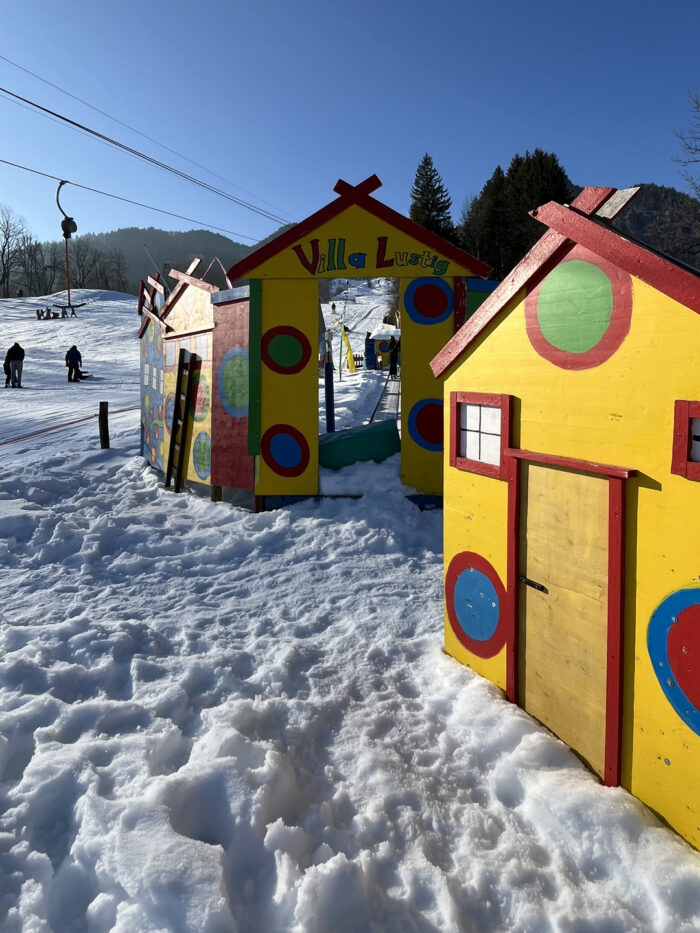 Mit den putzigen quietschgelben Hütten und ganzen 4 Zauberteppichen ist die Villa Lustig einfach der perfekte Startpunkt für alle kleinen Skifahrer. Unsere Kids standen dort im Alter zwischen 4-6 Jahren das erste Mal auf Skiern. Anfangs hat das Förderband noch mehr Spaß gemacht als das Skifahren selbst. Auch einen Seil-Lift können größere Kinder hier nutzen.